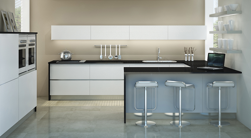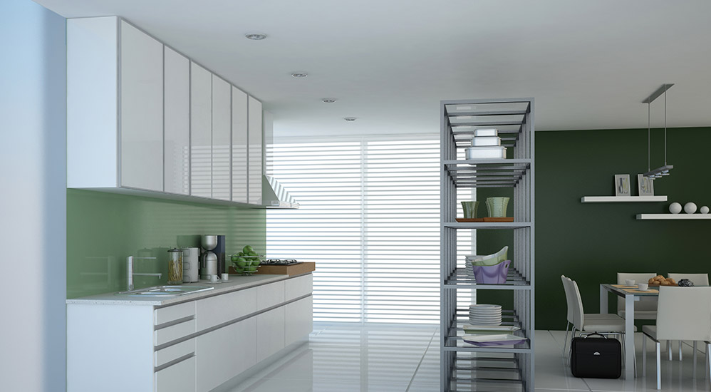 Tablero de MDF pantografiado con recubrimiento de Polímero en su cara exterior y Melamina Blanca en su cara interior. El tirador es parte de la puerta.